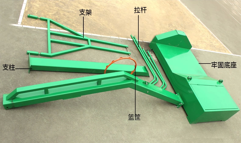 篮球架的主杆与底座之间的拉杆:优质圆形钢管两个与主杆形成三个三角型,保证整个篮球架的稳定。燕尾式拉杆采用直径40毫米圆管焊接而成。